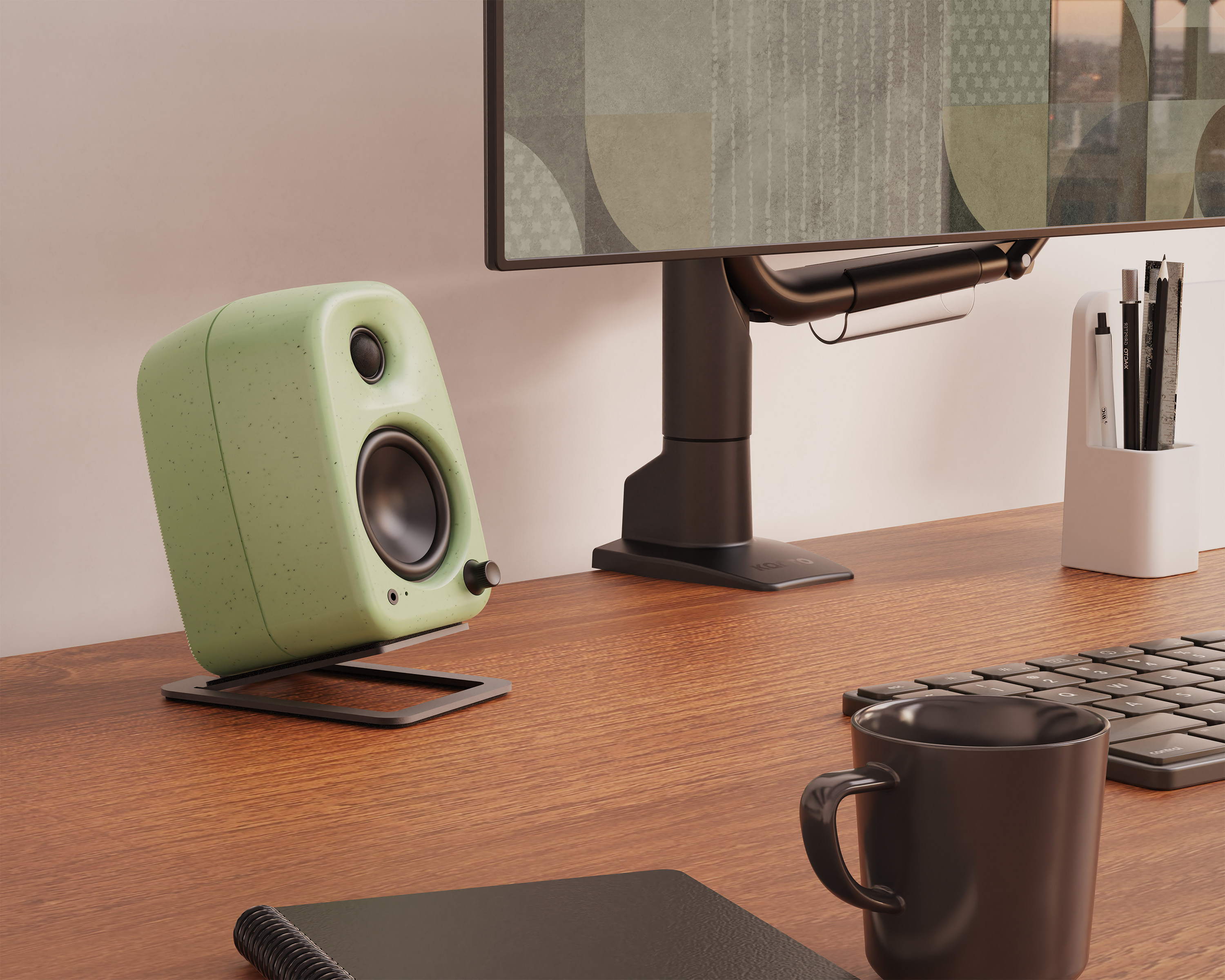 A headphone socket makes it an ideal companion for open spaces or home working when headphones are required. Four colours will be available at launch including black, white, cobalt and sage. Kanto also produce a range of dedicated stands for UKI.