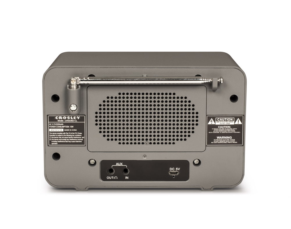 It includes aux-in, a headphone jack for bedside listening and a rechargeable lithium-ion battery, making it ideal as a travel companion. Finishes include Charcoal, Navy and White Sand.