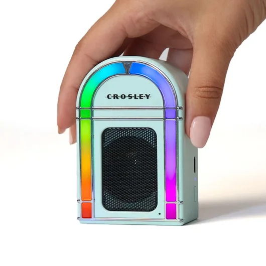 Inject a burst of colour and fun into any space with the Mini Jukebox. Inspired by Crosley’s classic full-size jukeboxes, this compact speaker features colour-changing LED lights that sync to the beat of the music. Pair two speakers for stereo playback, add on an optional carry strap and you have a perfect desk-side or kids bedroom companion. The battery allows up to 15 hours of listening and charges in around one hour via USB-C.