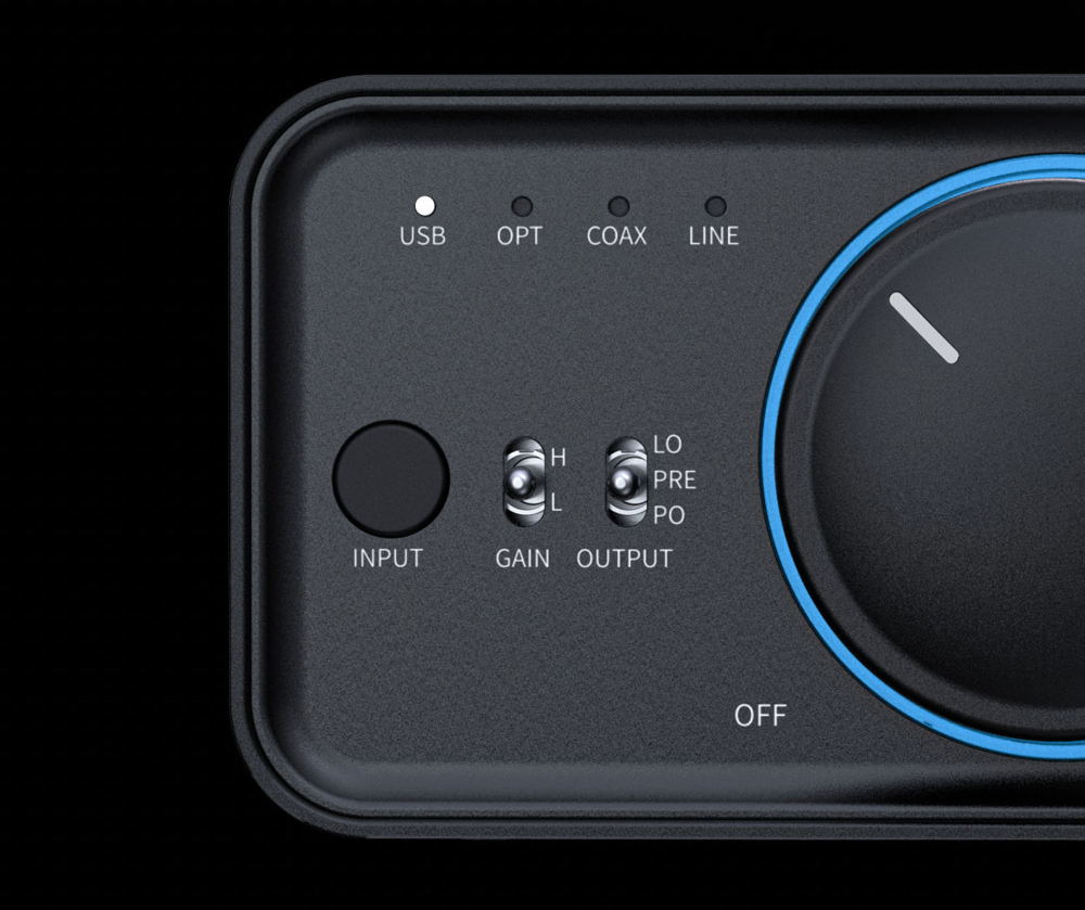 The indicator light surrounding the volume dial displays different colours dependent upon different audio sampling rates being received: 48kHz and below will display blue; 48kHz or more displays yellow; DSD files display as green.